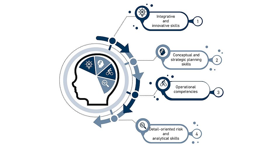As the Chair of Work, Organizational and Business Psychology and transzent , we are particularly interested in relevant key competencies such as system understanding, transferability and ethical and innovation-oriented leadership, which are essential for the design and management of circular economic systems in almost all areas of analysis, planning and execution in teams, individual employees, managers and management. Such competences are explained in Julius Kuhl's (2000) personality model via four functionally different, dynamic and interacting personality systems (see figure), which forms the basis for our project. This model is particularly relevant for the promotion of competences in the circular economy, as it not only includes manual, conceptual and economic skills, but also integrates intrinsic motivation, creativity, analytical and strategic thinking as well as communication skills and the development of a vision (purpose). In collaboration with the project consortium, we aim to develop and test concepts to teach and promote these key competences.